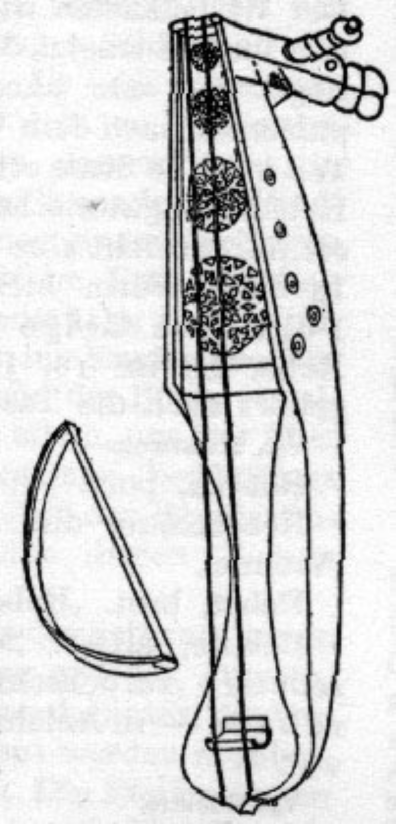 There was another type of fiddle found in medieval Europe which varied from the common fiddle not so much in form as in playing position. We do not know if it was thought of as a different instrument and had a separate name or whether it was considered only a variant technique. The family, referred to in later times as violas da gamba (the Italian for “leg,” from its playing location, rather than the shoulder) became very important in the Renaissance. It only occurs once in the Cantigas where it is given special treatment. The player sits on a throne; is it a portrait of a particular person at court? (See Note, below.) He is bareheaded but wears a noble’s manto and sports the fringe beard associated with the military. An especially relevant point for the Cantigas is that this “gamba” playing position was originally the norm: it came from the Middle East and is the only style outside of Europe. Even though the fiddle, structurally, is Christian, the playing position and perhaps, therefore, the musical style, is Muslim. And we have seen that knights were associated with another Islamic instrument, the Guitarra Morisca. This brings us to the next bowed instrument.